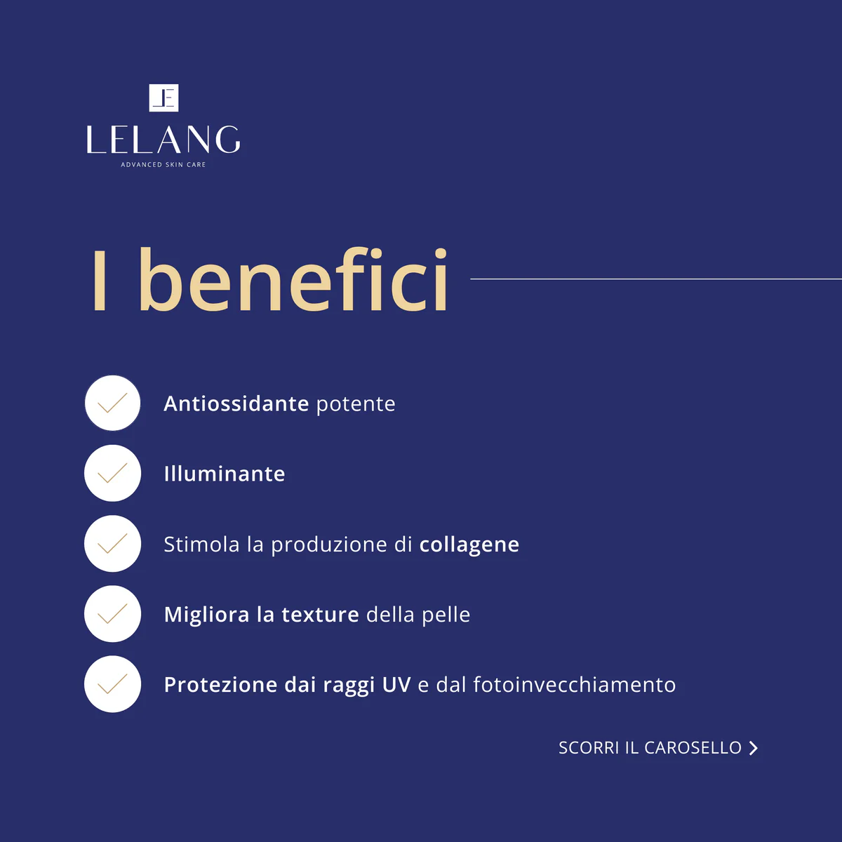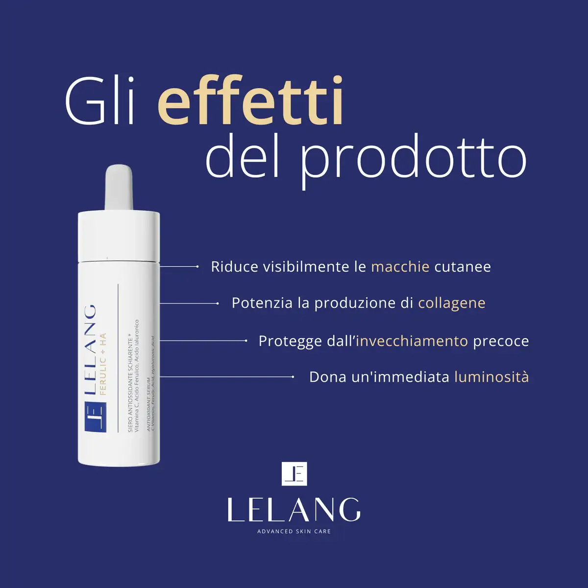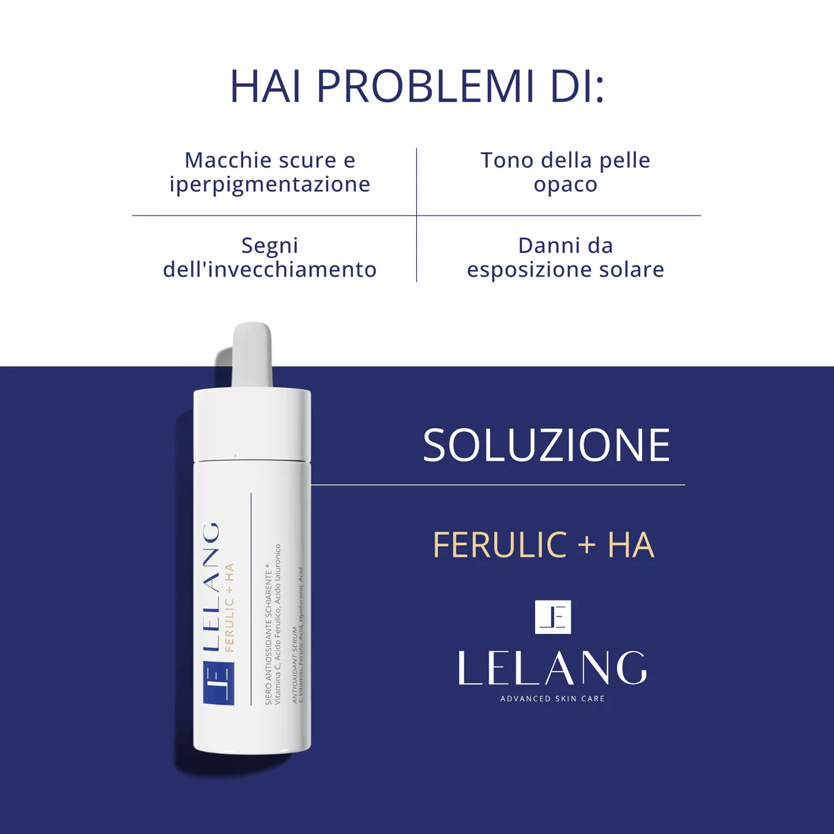 | Formula | FeruliC +HA è un siero antiossidante schiarente a base di Vitamina C stabilizzata, Acido Ferulico e due tipi di Acidi Ialuronici. La sua composizione innovativa previene la formazione delle macchie cutanee e schiarisce quelle esistenti, contribuendo a donare luminosità e brillantezza all’incarnato. La funzione antiossidante dell’Acido Ferulico è supportata da una forma più stabile di Vitamina C che stimola la produzione di collagene e previene l’invecchiamento precoce. Ferulic+HA contiene Tocoferolo Acetato, una forma di vitamina E che migliora l’assorbimento degli attivi presenti come la Vitamina C, due tipologie di Acidi Ialuronici che migliorano la pelle secca e disidratata, e Arginina, un aminoacido essenziale che migliora la circolazione sottocutanea. Ferulic+HA protegge la pelle dai danni ossidativi del sole, dell’inquinamento e del fumo e allo stesso tempo aiuta a prevenire l’invecchiamento precoce minimizzando rughe, perdita di tono e macchie. La sua texture avvolgente e viscosa non appiccica e permette al siero di essere utilizzato anche da solo. Presenta una nota olfattiva legnosa esclusiva di LeLang che neutralizza l’odore metallico dell’acido ferulico, in questo modo Ferulic+HA contiene concentrazioni di attivi elevate pur mantenendo una sensazione di piacevolezza sulla pelle. |