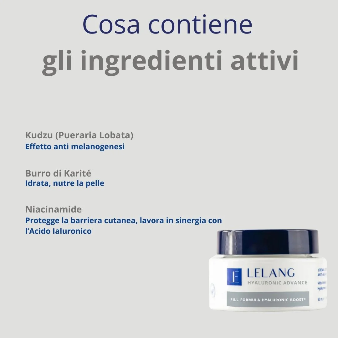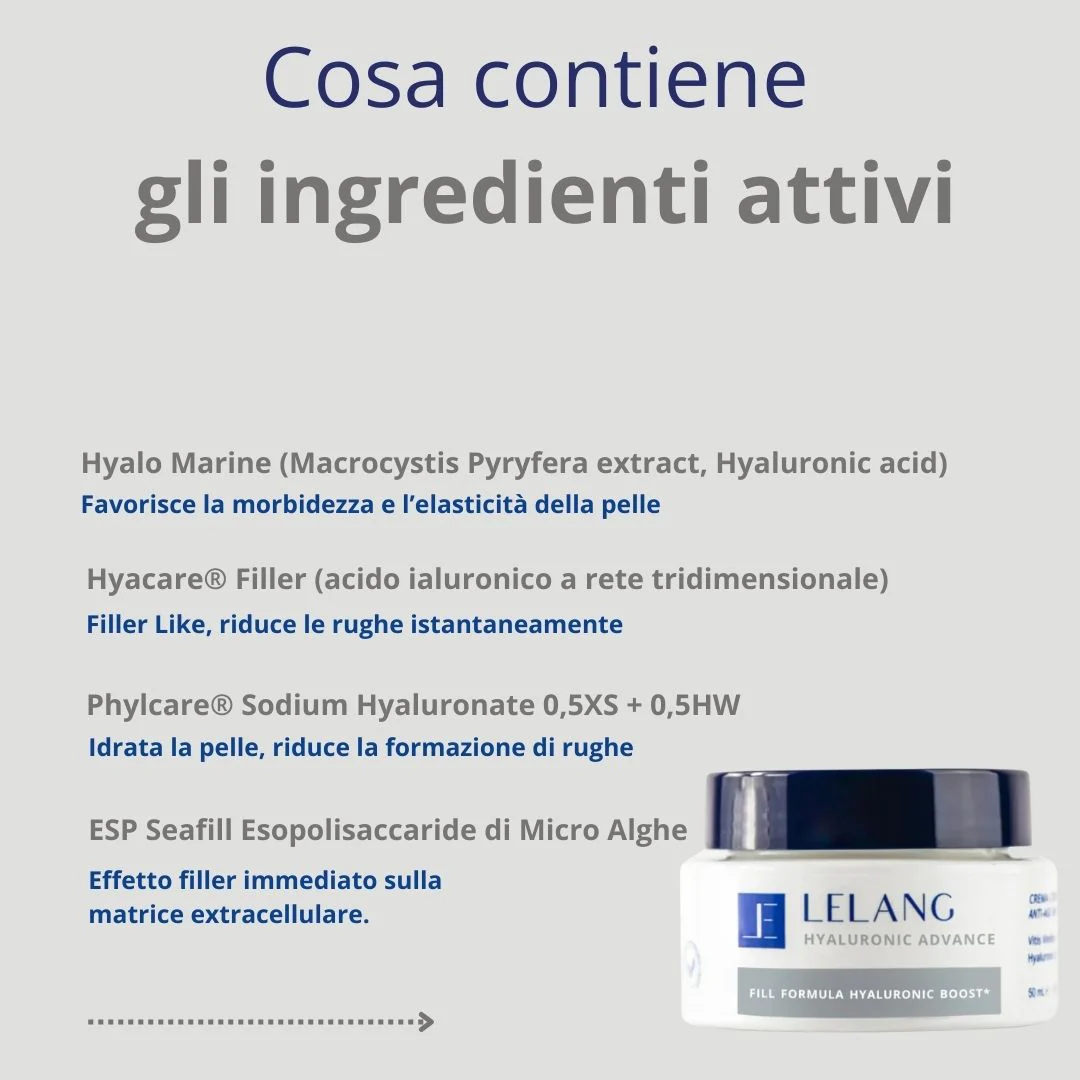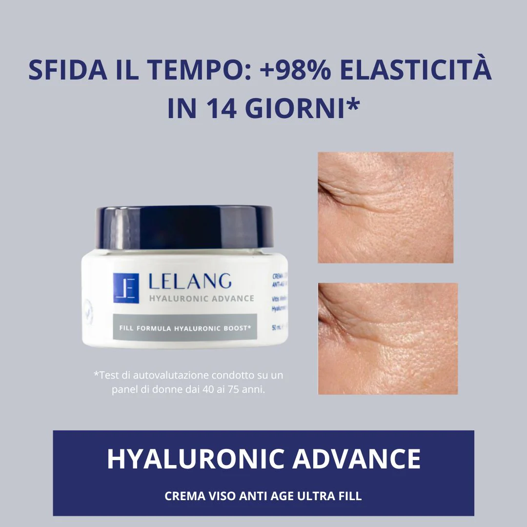 | Formula | Hyaluronic Advance è una crema viso anti-age che nutre intensamente e idrata in profondità, rendendo la pelle più elastica. Formulata con una potente combinazione di Acido Ialuronico di origine naturale e brevettata, caratterizzata da diversi pesi molecolari per un effetto filler ultra-immediato, Hyaluronic Advance agisce sulla matrice extracellulare riempiendo i solchi della pelle e ripristinando l'elasticità cutanea. Potenziata con Niacinamide e Kudzu, un’innovativa pianta asiatica ricca di flavonoidi anti-age, e con iso-polisaccaridi marini che stimolano l’azione dell’acido ialuronico, Hyaluronic Advance offre un effetto elasticizzante, filler e anti-age. Grazie alle diverse tipologie di Acido Ialuronico, questa crema promuove il ringiovanimento cutaneo, donando elasticità e un effetto riempitivo immediato, e stimola la produzione endogena di Acido Ialuronico. |